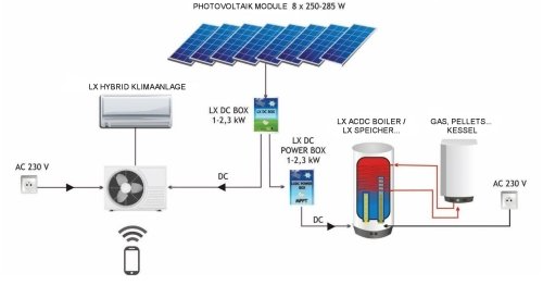 Vrlo jednostavno. Logitex LX ACDC/M bojler spojen je na izlaz tople vode iz vašeg velikog spremnika, a zatim je spojen na fotonaponske module. Logitex grijač će akumulirati sunčevu energiju. Ako su vremenski nepovoljni duže vrijeme, voda se može dodatno zagrijati na struju. Tijekom sezone grijanja, predgrijana voda iz vašeg velikog spremnika teče u bojler Logitex. Ovdje se ili dodatno zagrijava ili - ako je dovoljno toplo - samo protječe. Ako je sustav spojen na gore opisani način, nećete morati grijati kotao svaki dan i grijat ćete samo tijekom sezone grijanja.